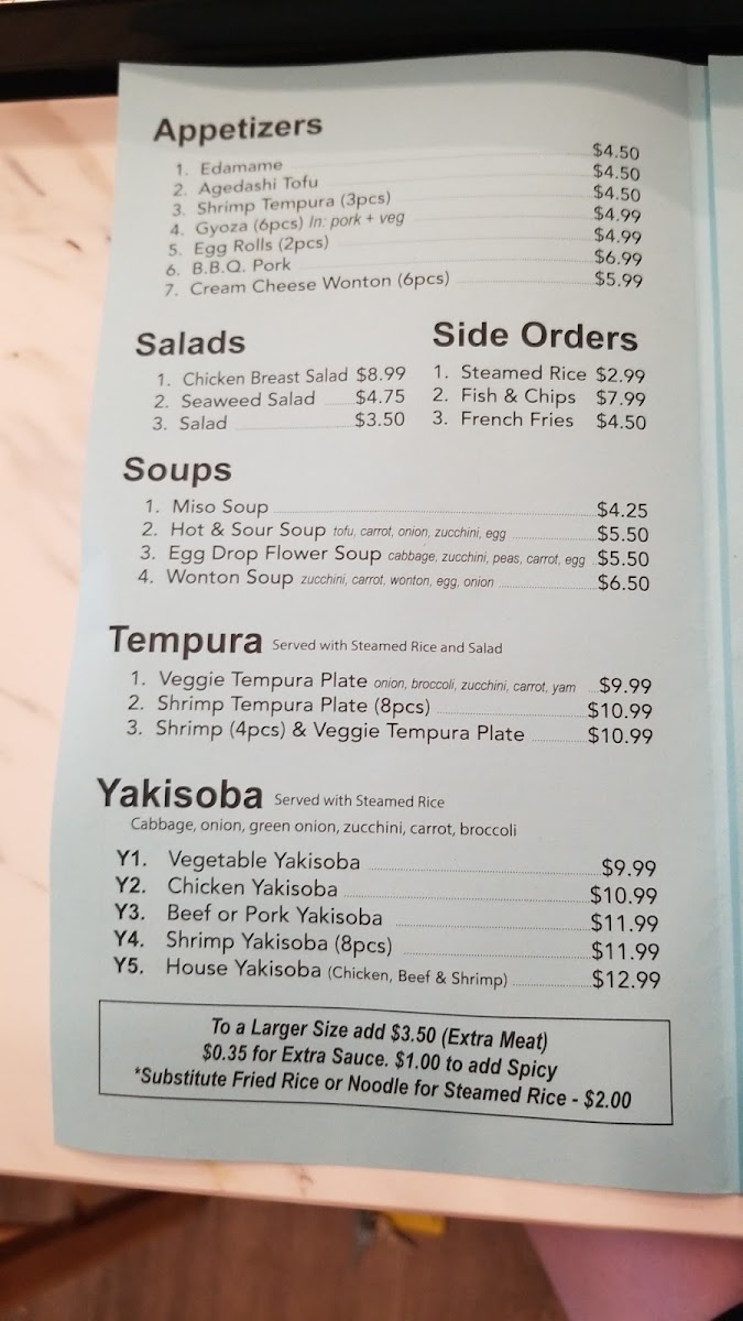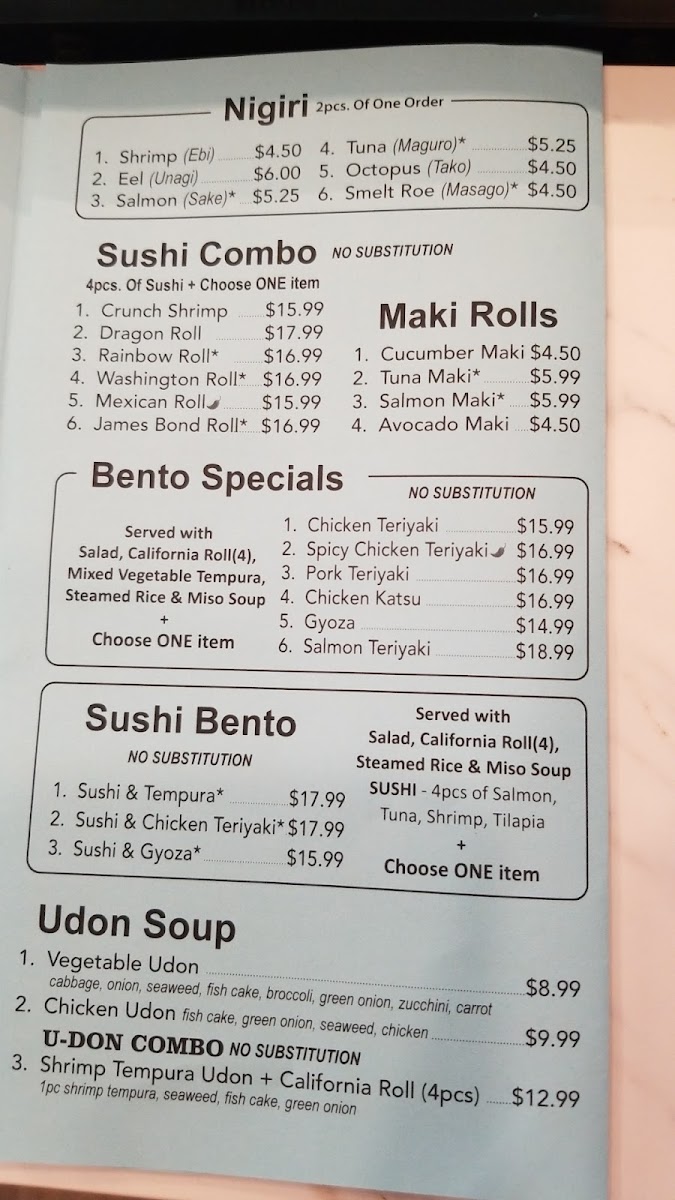 The menu also offers gently spiced and familiar flavors such as Kung Pao Chicken & Beef Teriyaki Combo and vegetarian choices like Agedashi Tofu or Crunchy Tofu, accommodating a range of tastes while keeping the experience straightforward and comforting.